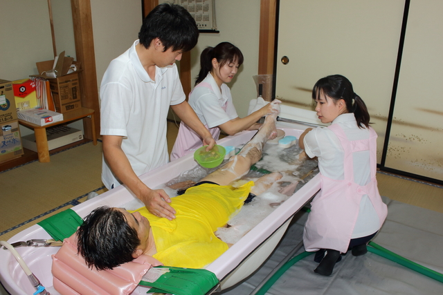 利用者さんが普段生活をしている場所から移動して、入浴開始。入浴は大体10分~15分を目安に行っております。ご希望があれば、入浴剤もご使用頂けます。